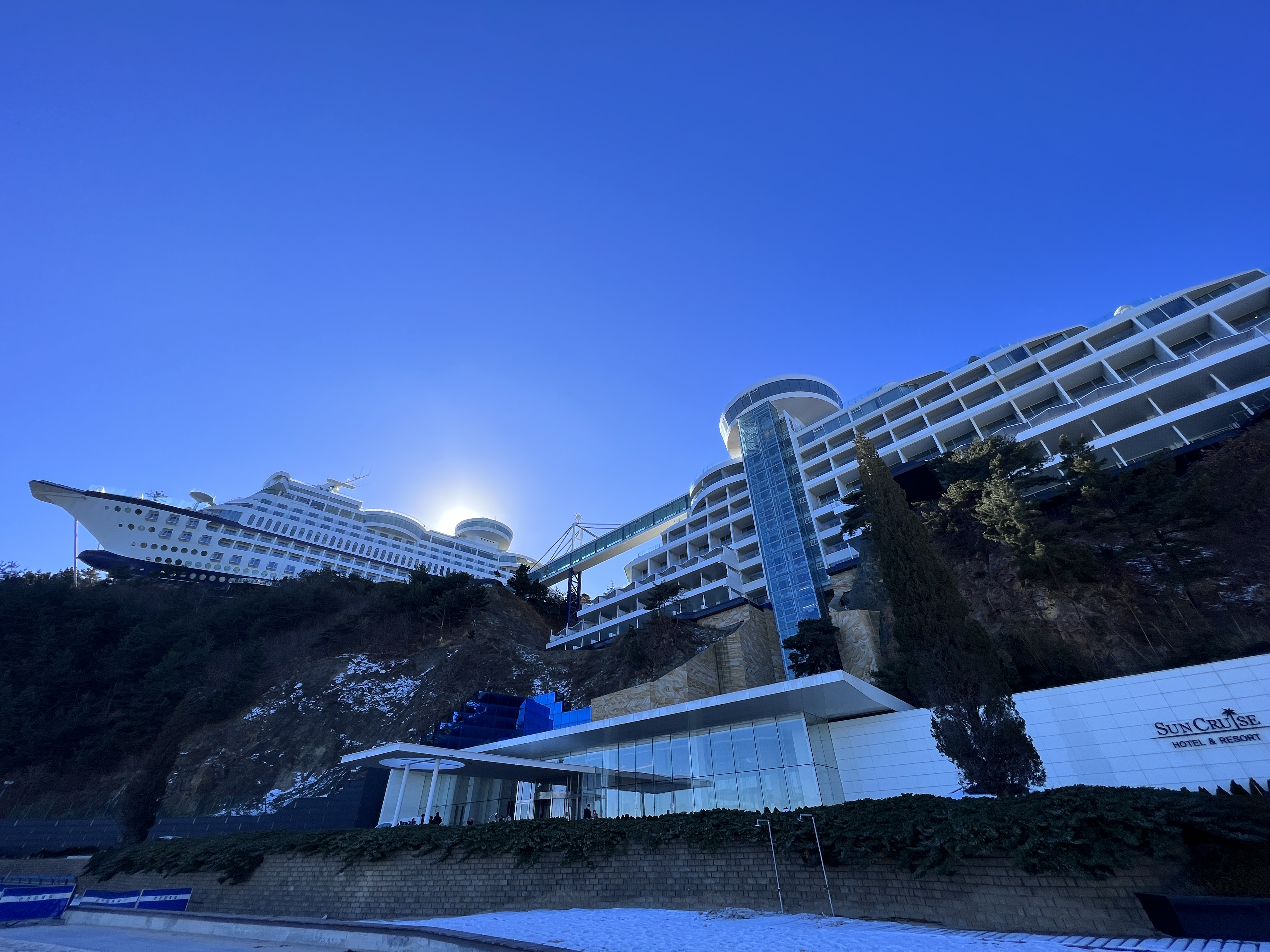 정동진은 저의 어린 시절에 모래시계라는 드라마 때문에 굉장히 유명했었고, 여전히 해돋이 명소로 손꼽히며 많은 분들이 찾는 곳입니다. 정동진 하면 모래시계 드라마를 떠오르는 분들이 많으실 거예요. 모래시계만큼 유명한 것이 산 중턱의 큰 모형의 호텔 & 레스토랑입니다. 저는 20대 초반 이곳의 레스토랑을 한번 방문했었지만 호텔은 이번이 처음입니다. 아래의 사진과 같이 배 모형의 호텔 아래로 신축 건물이 풀빌라가 있는 호텔 건물이에요. 구관과는 다리로 연결이 되어 있습니다.