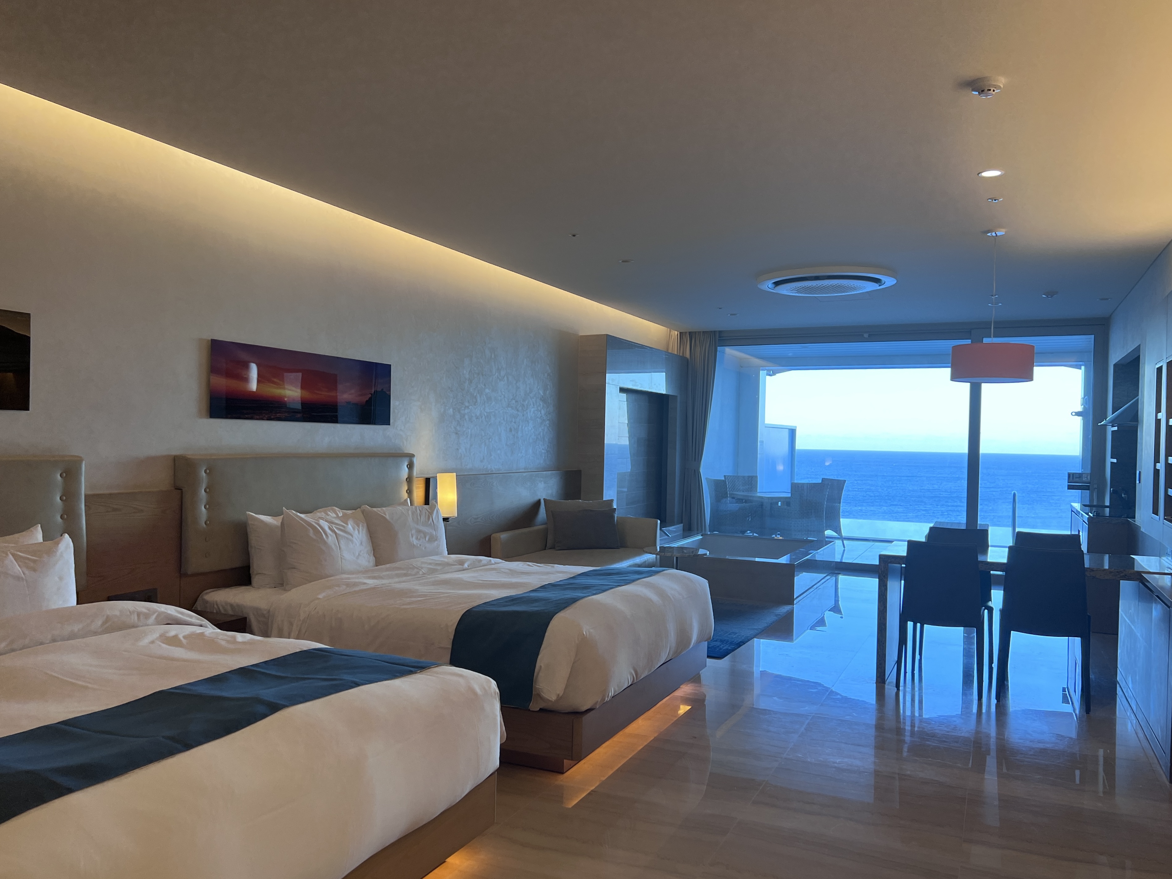 저녁을 먹고 또 수영을 했습니다. 오후부터 저녁까지 수영과 쉼을 반복하며 했더니 생각보다 빨리 지쳤습니다. 또한 날씨도 추워 피로함이 더욱 더 크게 느껴졌어요. 때문에 저녁식사 및 수영을 마친 후 생각보다 이른 시간에 잠에 들었어요. 정동진에 왔으니 꼭 해돋이를 봐야겠다는 생각도 있어서 무리하지 않았습니다. 객실이 바다를 바로 마주하기 있기 때문에 수영을 하며 해돋이를 보는 계획을 갖고 있었는데, 그랬다면 해돋이를 못 봤을 거예요. 해가 뜨는 위치가 신관에서는 구관에 가려 보이지 않습니다. 혹시라도 저와 같은 생각을 하신다면 조금 더 서둘러 구관의 전망대로 가시길 바라요. 신관 객실에서는 절대 해돋이를 보실 수 없습니다. 실제로 제가 이동 중 해돋이를 보려고 신관 베란다에 잠옷을 입고 나와 계신 분들을 많이 봤는데, 해돋이를 못 셨을 거예요.