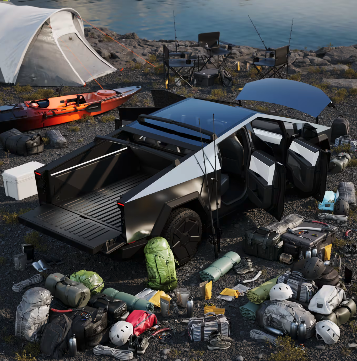 사이버트럭의 적재공간은 약 2,800리터의 용량입니다. 많은 영상에서 확인 할 수 있듯이 후면 적재공간에는 전기4륜 오토바이인 사이버쿼드를 싦을 수 있습니다. 약 10cm의 서스펜션 높이조절이 가능하며, 견인력까지 우수하여 캠핑트레일러, 보트 등의 견인에서 부족함이 없을 것으로 예상됩니다.