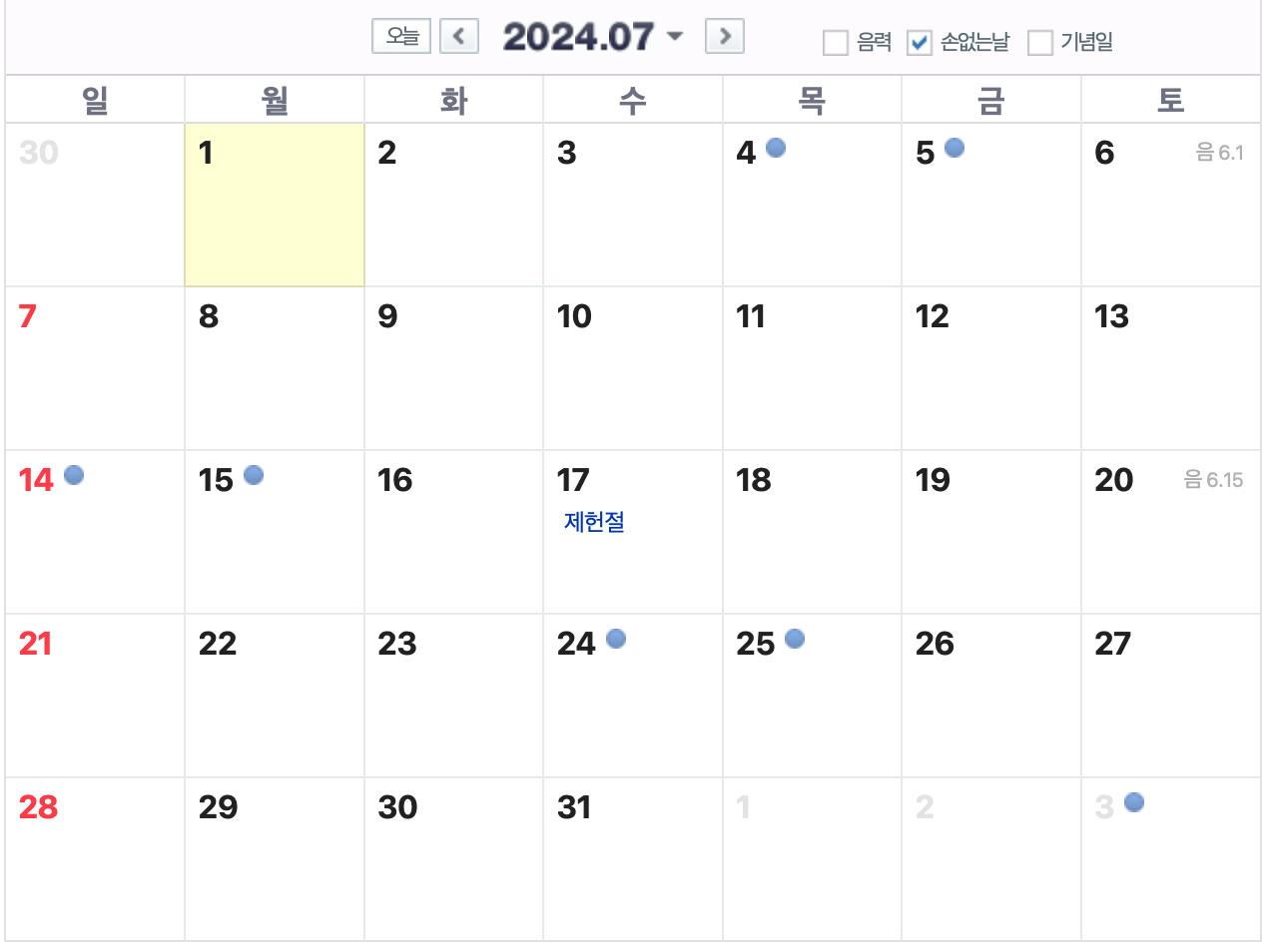 - 7월 손없는날 : 4일, 5일, 14일, 15일, 24일, 25일