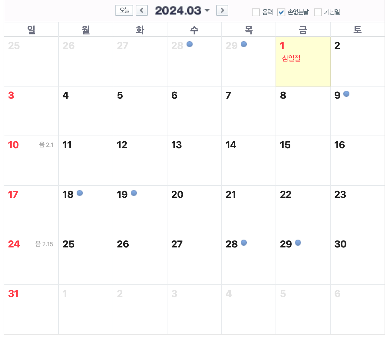아래 달력의 파란색 점이 손없는날 입니다.
