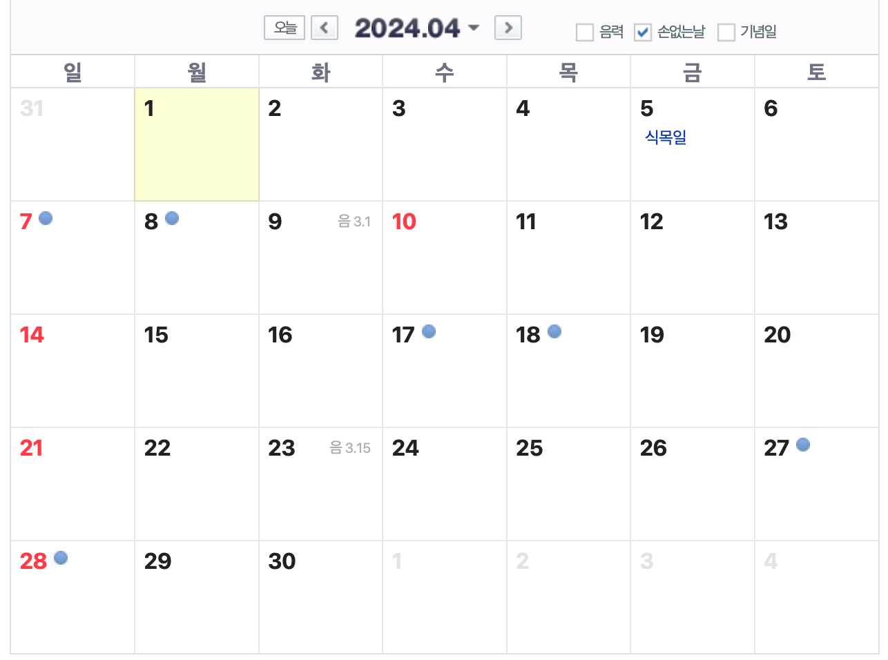 - 4월 손없는날 : 7일, 8일, 17일, 18일, 27일, 28일
