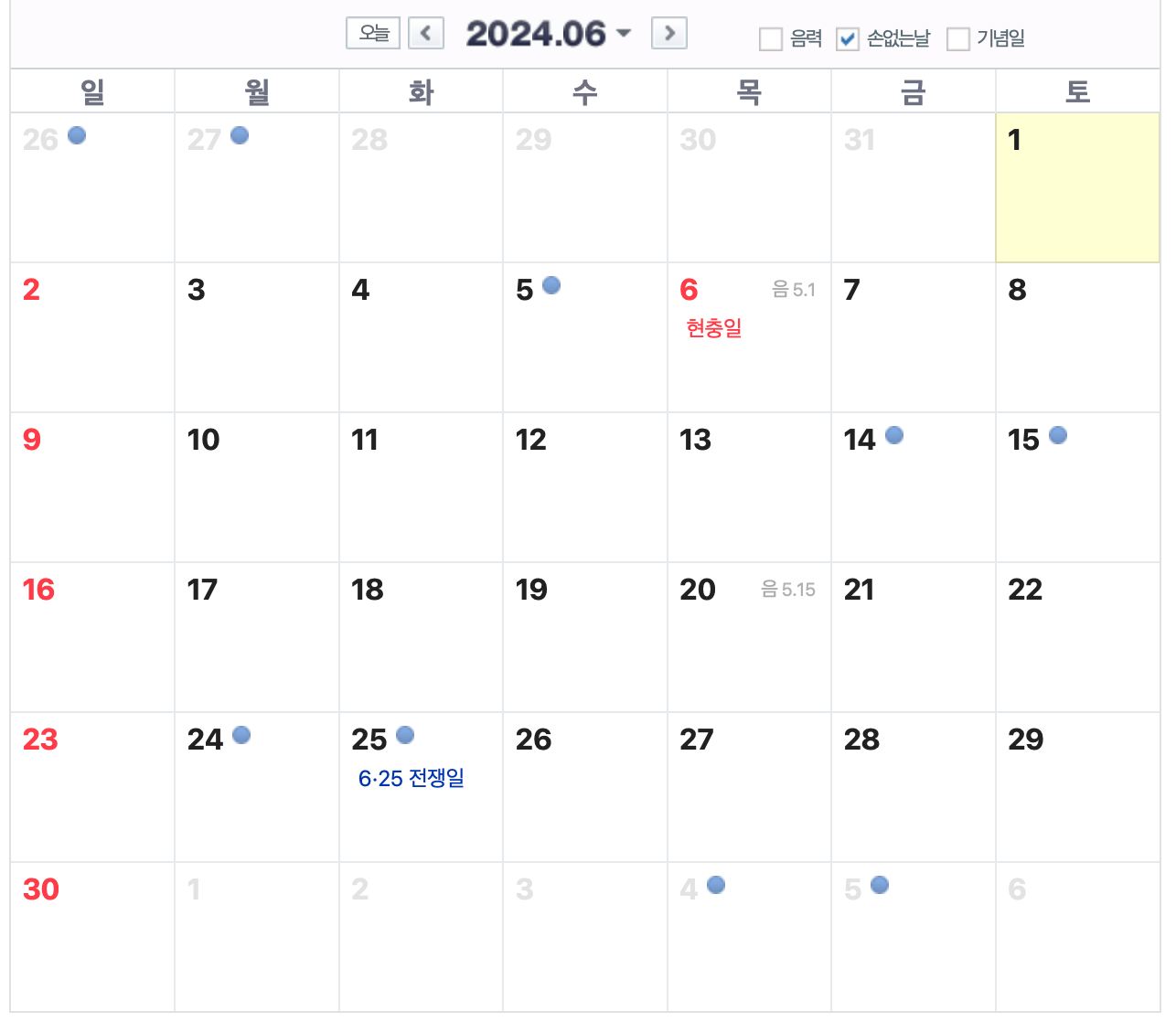 - 6월 손없는날 : 5일, 14일, 15일, 24일, 25일