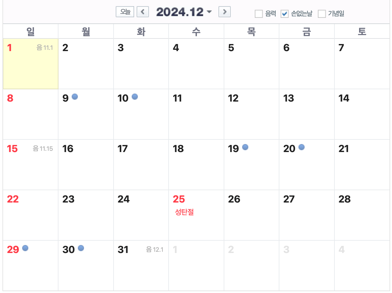 - 12월 손없는날 : 9일, 10일, 19일, 20일, 29일, 30일